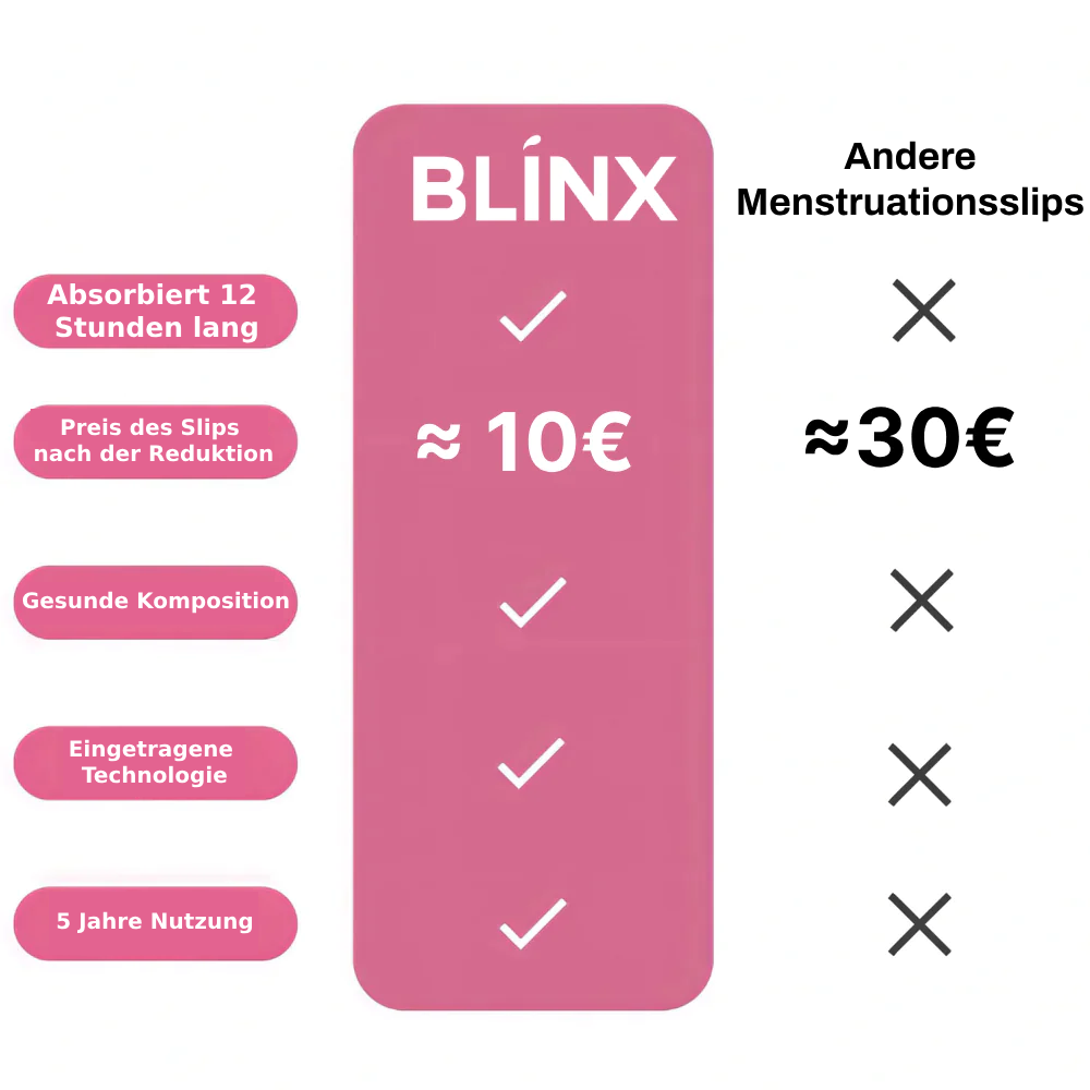 "Mit meiner BLINX bin ich äußerst zufrieden, auch trotz meiner sehr (sehr, sehr, sehr) starken Menstruation. Sie sind angenehm zu tragen, äußerst wirtschaftlich und umweltfreundlich!"